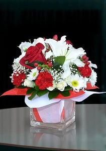 Red Rose, White Rose, Lily, Carnation and leaves.
